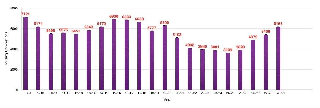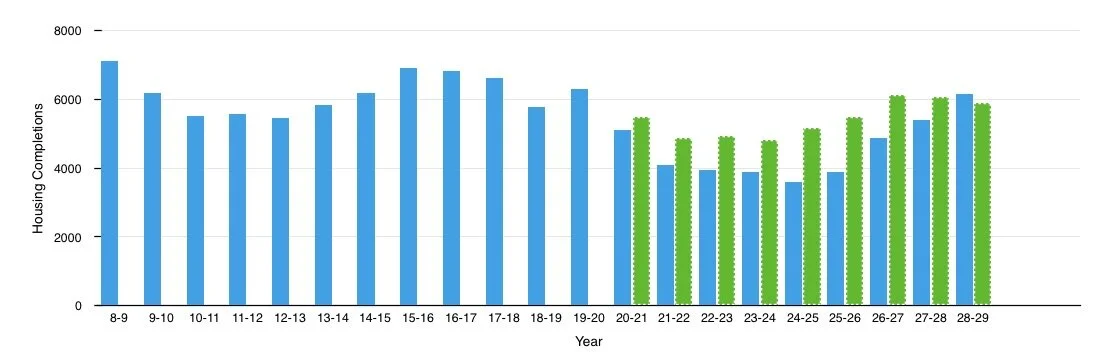 Welsh Government Central Estimates of housing need indicate an average of 7000 dwellings is required per year until 2028-29. The last time more than 7000 dwellings were completed in Wales was 2008-9. The forecast suggests completions might not reach the average estimate of need at any point this decade. The shortfall against the Central Estimate of need could grow to 21700 units by 2028-29 were UK performance repeated or nearly 14000 if the Welsh pattern replicates itself. To give some kind of context to a looming delivery crisis, RSLs and Local Authorities have completed some 1200-1300 dwellings/year since 2015-16. They barely touch the sides of need.